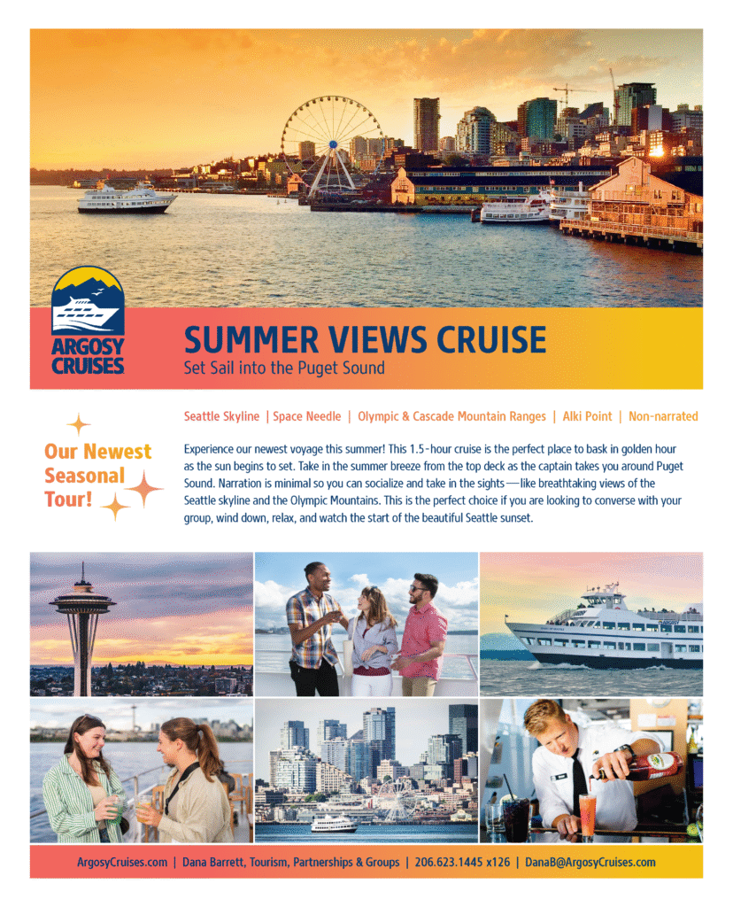 Feel the cool summer breeze and soak up the Seattle skyline, Space Needle, and Olympic Mountains as the sun paints the sky gold. This isn’t your average sightseeing tour — it’s a chill, good-vibes-only cruise where the soundtrack is laughter, good company, and maybe a splash of music on deck.